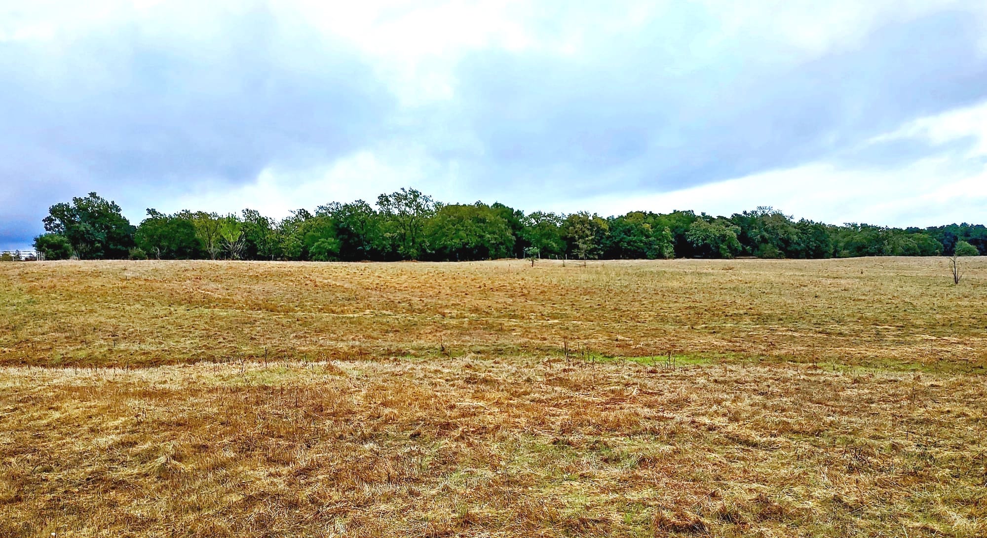 Next day, I’m out in the field with the dog, seventy blissfully unoccupied acres, skies of varying, splotchy soft gray-blueish, open fleece vest air temp. Across the field, a long wall of trees at the edge of the woods. A moment and a place without traffic noise, shouts, leaf blowers, phone conversations, or heavy equipment backup beepers.